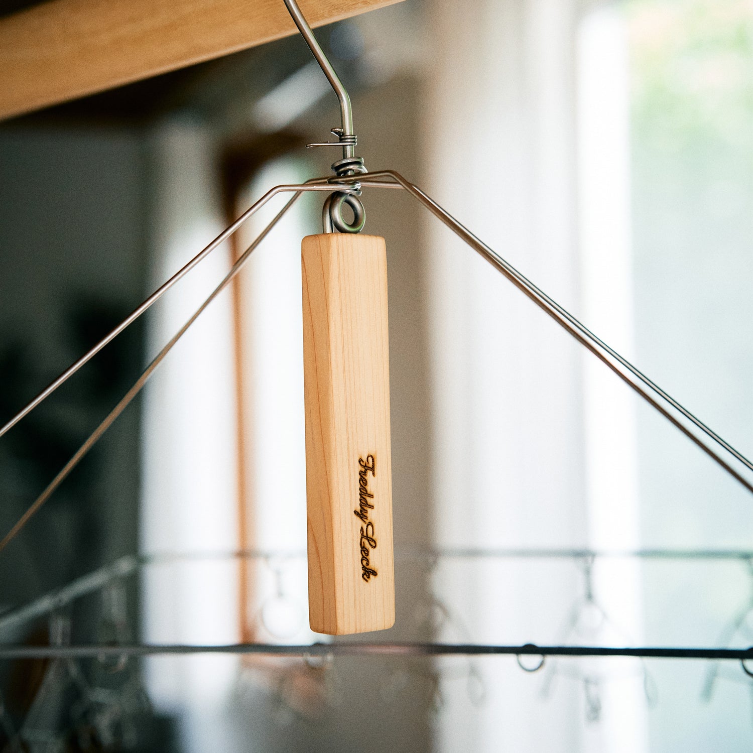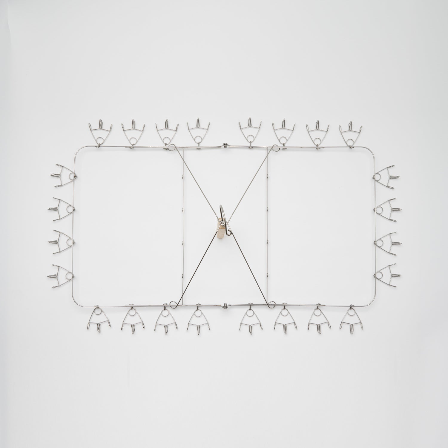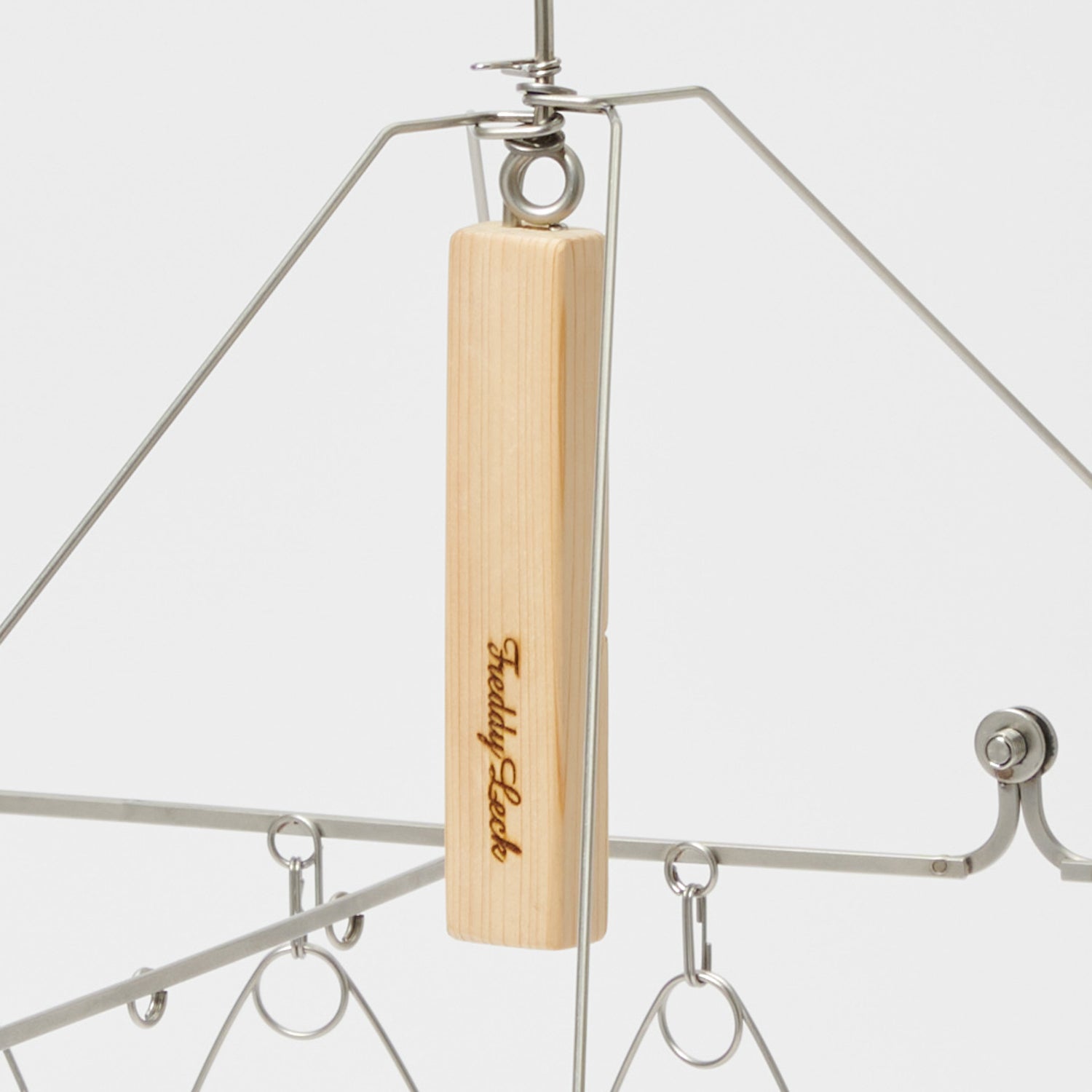 フレームが上に閉じる構造で、使わないときはフックをかけたまま収納できます。吊るしておくだけでも美しい佇まいで、暮らしの景色にそっと寄り添うデザインです。