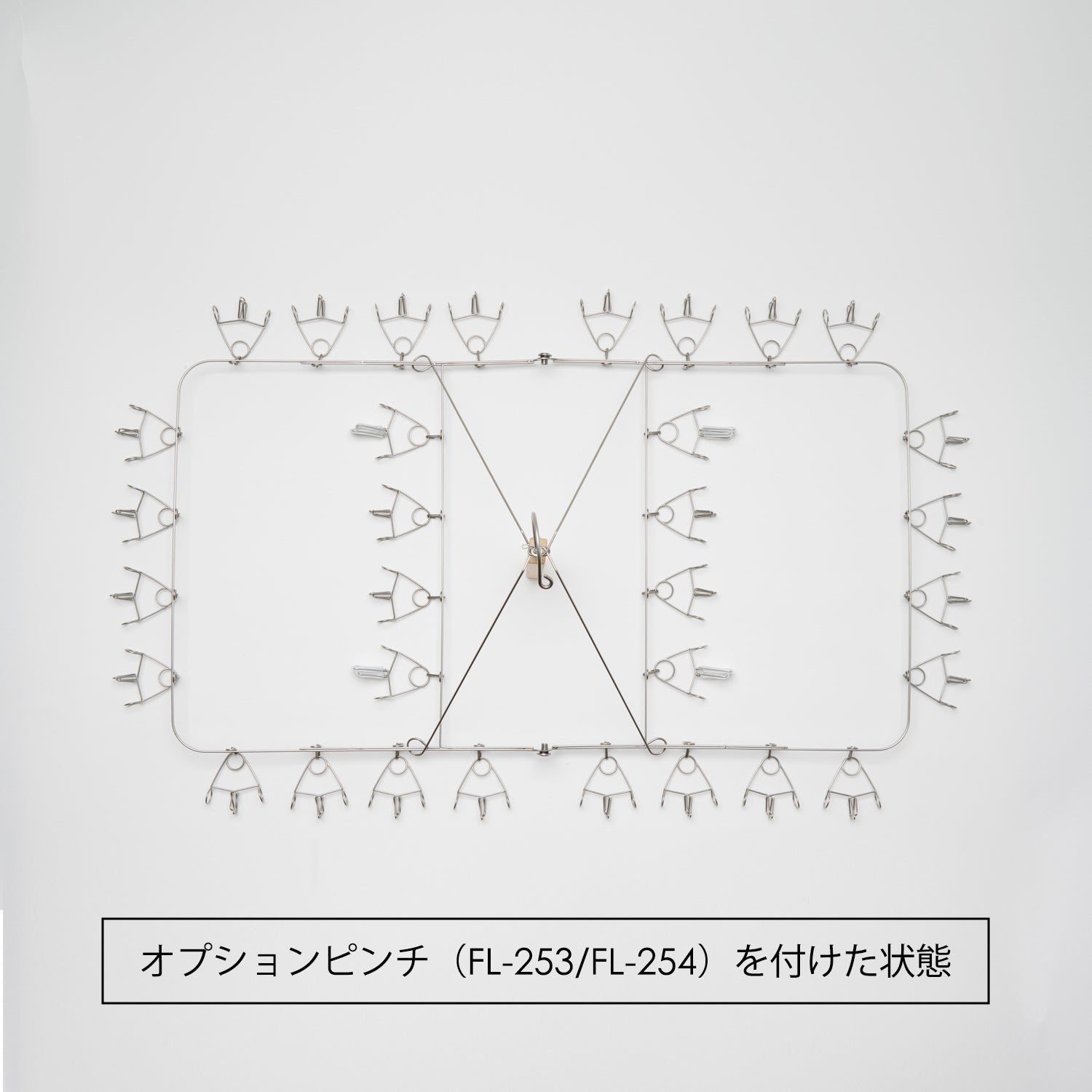 ハンガー本体と同仕様のオプションピンチ(FL-253 耐荷重0.8kg)・デニムなどの濡れると重たくなる洗濯物もしっかりはさめる、耐荷重をアップした滑り止め付きのオプションピンチ(FL-254 耐荷重2.0kg)の2種類です。
